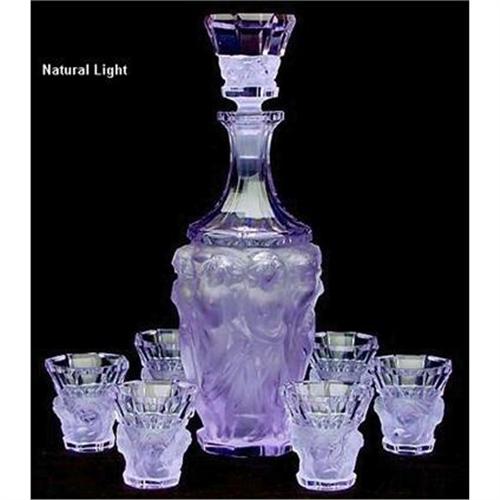 <table width="100%" border="0" cellspacing="0" cellpadding="4"><tr><td><em> </em></td></tr><tr> <td width="100%"> EXCLUSIVELY made for our Company ?. absolutely STUNNING Lalique inspired Alexandrite Decanter Set with a Classy NUDES Motif. This Art Deco style Set was made in the Bohemian Region of the Czech Republic from the FINEST quality Alexandrite (also referred to as Neodymium) Glass using the ORIGINAL VINTAGE molds. This set is brand NEW/NEVER USED and is an EXACT replica of its Art Deco predecessor dating to the 1920's. The Decanter Bottle features 8 Scantily Draped NUDE Maidens with Flowing Hair and is artist engrave signed, F.H., standing for Frantisek Halama. This Set includes 6 matching Glasses that each measure 2 1/8" tall and 2 1/8? across. As with any Alexandrite Glass piece, this set is a LOVELY light lavender color in natural light and changes to a pale blue when under fluorescent light (as shown in the photo). Comes complete in a satin lined gift box with a SIGNED Certificate of Authenticity. </td></tr><tr> <td> </td></tr><tr> <td>Reference #: 6001656A2</td></tr><tr><td>Condition:EXCELLENT - NO Damage!</td></tr><tr><td>Year:20th Century</td></tr><tr><td>Country:UNITED STATES</td></tr><tr><td>Maker:Frantisek Halama</td></tr><tr><td>Height:10.5</td></tr><tr><td>Width:4</td></tr><tr><td>Weight:9.5</td></tr><tr><td>Title:Czech Bohemian ALEXANDRITE Nude Decanter Set </td></tr><tr><td>Style:NUDES - Art Deco</td></tr><tr><td>Materials:Alexandrite Glass</td></tr><tr><td>Location:Sunbury, Ohio </td></tr></table>