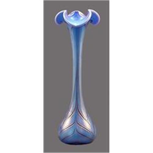 CZECH BOHEMIAN BLUE IRIDIZED ART GLASS VASE<p> Available for purchase is an ABSOLUTELY STUNNING Art Glass Vase. This Loetz inspired Vase was hand made in the Bohemian region of the Czech Republic from the finest quality mouth blown Glass. It is from a collection of very select pieces made by the Stepanek Studio and is Artist engrave signed ?VS/06? for the artists initials and year it was made. It features the ?Stepanek Studio? gold foil label to guarantee its authenticity and comes in its original satin lined gift box. </p><p>This LOVELY Vase stands an impressive 12 1/2? tall and 4 1/4? across its widest and has a smooth finished, unground Pontil. This Vase is comprised of an Icy Blue base color with a Bronzish tone threading in a ?pulled feather? effect that is iridized with gold tones. The ruffled top is Cobalt Blue with a White rim and is iridized with Silverish tones giving it the AWESOME high quality ?Stretch Glass? look. </p><p>This Vase is in EXCELLENT condition with absolutely NO DAMAGE!! It truly rivals the quality and artistry of the famous Czech Art Glass maker Loetz. Photos do not capture the QUALITY or BEAUTY of this HIGHLY IMPRESSIVE piece .... we GUARANTEE you will not be disappointed!! This Vase can do nothing other than make an AWESOME addition to any Art Glass collection ?. DON?T MISS OUT!!! #72112