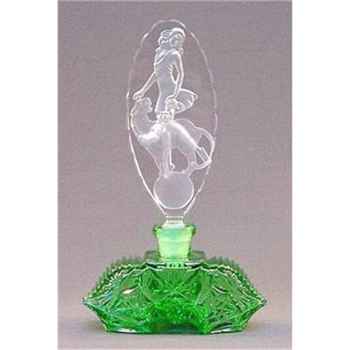 CZECH EMERALD COLOR GREEN PERFUME BOTTLE W/ LADY & LION DBL INTAGLIO STOPPER<p>Available for purchase is an absolutely BEAUTIFUL Czech Perfume Bottle. This STUNNING Perfume was made in the Bohemian Region of the Czech Republic by Jaroslav Pesnicak. The HIGHLY cut & polished Bottle was made from the finest quality Emerald Green colored Glass and is artist acid etch signed, Pesnicak. The Stopper was made from the finest quality Crystal and is a RARE DOUBLE INTAGLIO with the décor of a scantily clad Lady & Lion standing on a ball, also commonly referred to as ?The Circus?. This Perfume is quite a RARE find as it was made using the SAME VINTAGE mold as was the original Art Deco predecessor of this Perfume dating back to the 1918-1938 ERA. </p><p> This LOVELY PERFUME Bottle measures 6 3/8? tall (including stopper) & 4? across its widest. The Stopper is in excellent condition with absolutely NO damage!! The Bottle, however, has some minor flea bites along the edges of the many facets. These flea bites cannot be seen when the Bottle is displayed and do not distract from the beauty. The original predecessor of this entire Perfume Bottle is pictured in the well known and highly accredited Book ?Czechoslovakian Perfume Bottles & Boudoir Accessories, Revised Edition? (Bottle ? Page number 48 & Stopper ? Page number 53). Most notable is the current value listed in the Book?s ...