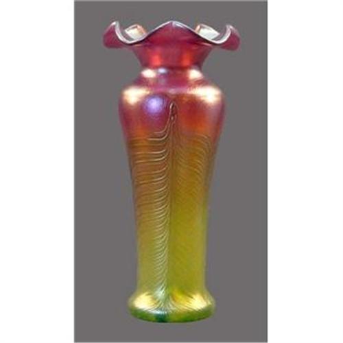 CZECH BOHEMIAN RASPBERRY TO GREEN IRIDIZED ART GLASS VASE<p> Available for purchase is an ABSOLUTELY STUNNING Art Glass Vase. This Vase was hand made in the Bohemian region of the Czech Republic from the finest quality mouth blown Glass. It is from a collection of very select pieces made by the Stepanek Studio and is Artist engrave signed ?VS/06? for the artists initials and year it was made. It features the ?Stepanek Studio? gold foil label to guarantee its authenticity and comes in its original satin lined gift box. </p><p>This Vase stands 9 1/2? tall and 4 1/2? across its widest and has a smooth finished, unground Pontil. It is comprised of a base color, as viewed from inside the Vase, of Green alternating with Gold tones. The exterior of the Vase ranges in color from the Goldish-Raspberry ruffled rim to the Green alternating with Gold ?feather-like threads? in a pulled feather effect down to the Base. </p><p>This Vase is in EXCELLENT condition with absolutely NO DAMAGE!! The Stepanek Studio pieces are of the highest quality Art Glass produced today and truly rival some of the finest Art Glass ever produced. Photos do not capture the QUALITY or BEAUTY of this HIGHLY IMPRESSIVE piece .... we GUARANTEE you will not be disappointed!! This Vase can do nothing other than make an AWESOME addition to any Art Glass collection ?. DON?T MISS OUT!!! #7115