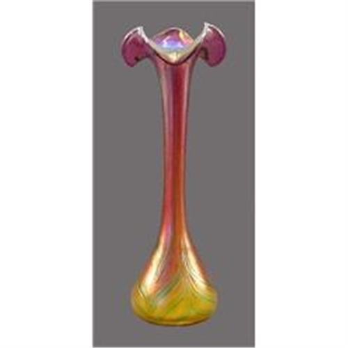 CZECH BOHEMIAN RASPBERRY TO GREEN IRIDIZED ART GLASS VASE<p> Available for purchase is an ABSOLUTELY STUNNING Art Glass Vase. This Loetz inspired Vase was hand made in the Bohemian region of the Czech Republic from the finest quality mouth blown Glass. It is from a collection of very select pieces made by the Stepanek Studio and is Artist engrave signed ?VS/06? for the artists initials and year it was made. It features the ?Stepanek Studio? gold foil label to guarantee its authenticity and comes in its original satin lined gift box. </p><p>This LOVELY Vase stands an impressive 12 1/2? tall and 4 1/2? across its widest and has a smooth finished, unground Pontil. This Vase ranges in color from a Raspberry base color with Green threading that is iridized with Gold tones to a Gold base color alternating with Green ?feather-like threads? in a pulled feather effect down to the Base. The Raspberry ruffled rim is also iridized with gold tones giving it the AWESOME high quality ?Stretch Glass? look. </p><p>This Vase is in EXCELLENT condition with absolutely NO DAMAGE!! It truly rivals the quality and artistry of the famous Art Glass maker Loetz. Photos do not capture the QUALITY or BEAUTY of this HIGHLY IMPRESSIVE piece .... we GUARANTEE you will not be disappointed!! This Vase can do nothing other than make an AWESOME addition to any Art Glass collection ?. DON?T MISS OUT!!! #72113