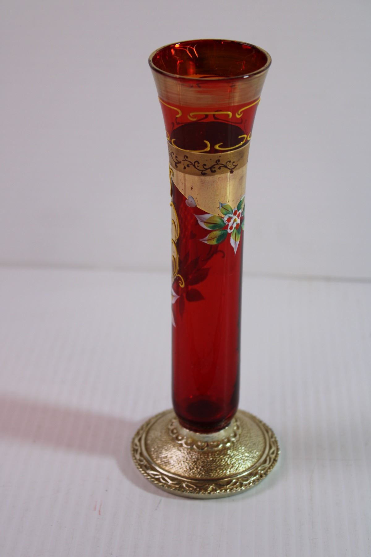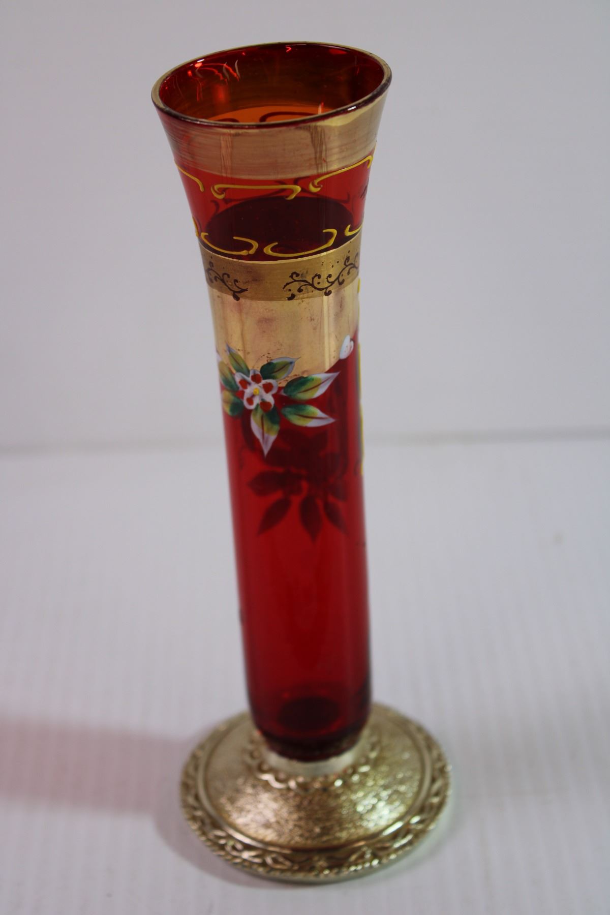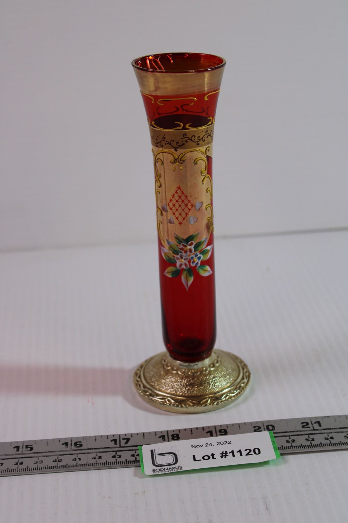 Czech Bohemian Red Glass Hand Painted Vase (7-3/4”)