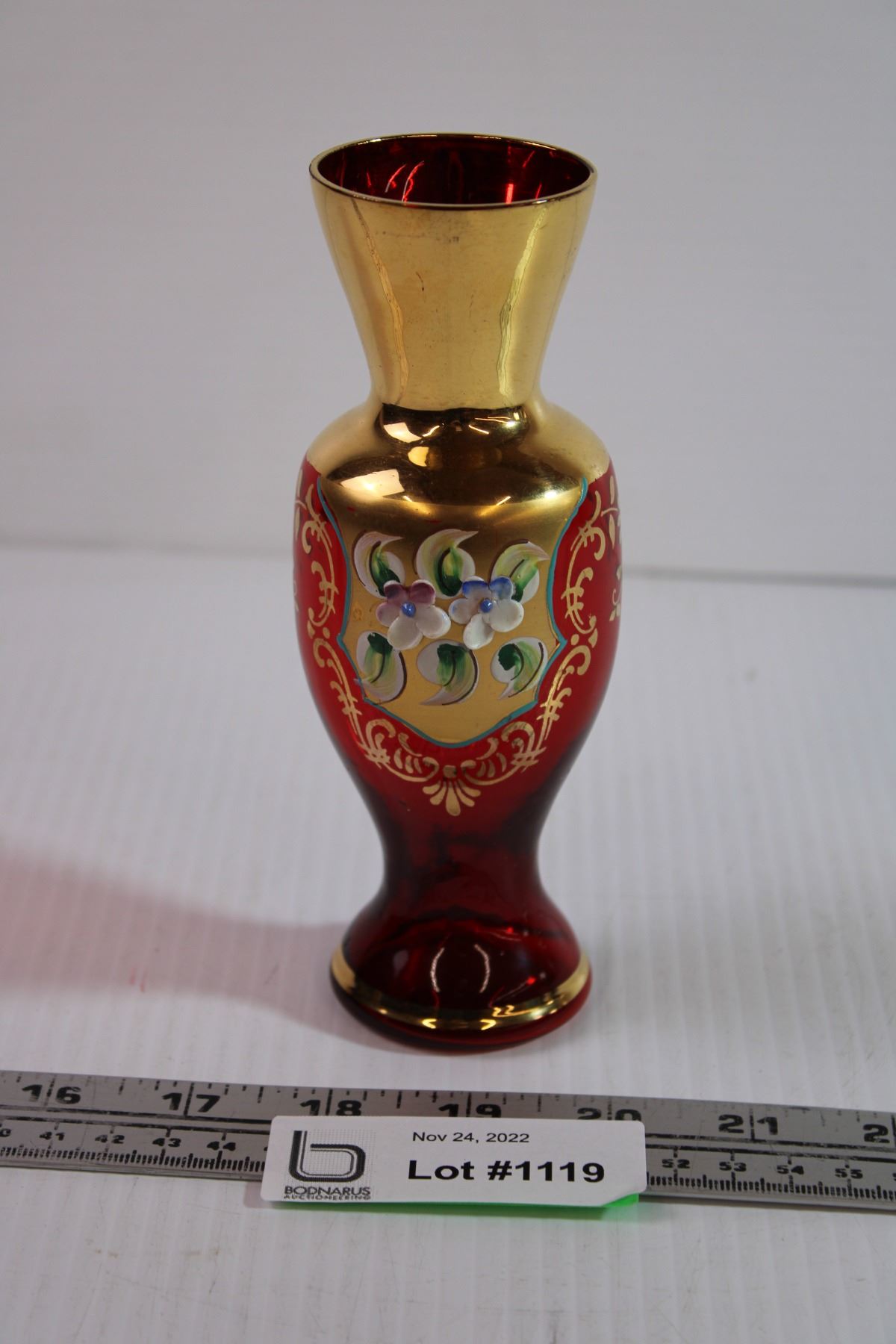 Czech Bohemian Red Glass Hand Painted Vase (7”)