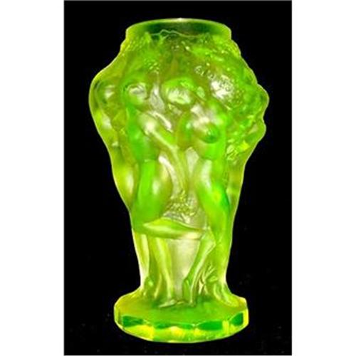CZECH BOHEMIAN VASELINE VASE <p>Available for purchase is a quality Lalique inspired Vase with the classic Grape Harvest & Maiden Motif. This Vase was made in the Bohemian Region of the Czech Republic from the finest quality YELLOW Vaseline Glass. It features six frolicking scantily clad maidens and has a cut & polished base that is acid etch signed, Desna, the sign of a FIRST QUALITY original. The Desna Collection has reintroduced glass masterpieces for the first time in decades using the same Vintage molds that were used at the beginning of the 20th century. Many of these Art Nouveau & Art Deco masterpieces have not been seen since before World War II when they were scarcely available in very limited quantities and select styles. </p><p>This LOVELY Vase measures 5" tall & 2 3/4" across its widest part. It is in EXCELLENT condition with absolutely NO DAMAGE!! It fluoresces wonderfully under blacklight due to the Uranium content in the glass. It comes complete in its original box with a Certificate of Authenticity, further guaranteeing this piece is FIRST QUALITY. This Vase would make an AWESOME addition to any Vaseline Glass Collection ?. DON?T MISS OUT!! #25529125