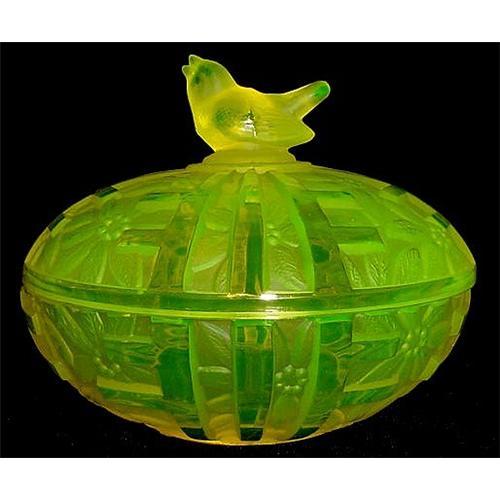 AWESOME Lalique inspired Vaseline Covered Candy Dish with a Floral motif featuring a Bird Finial. This Art Deco style Candy Dish was made in the Bohemian Region of the Czech Republic from the finest quality YELLOW Vaseline Glass using the ORIGINAL VINTAGE molds. It is BRAND NEW/NEVER USED and is an EXACT replica of its Art Deco predecessor dating back to the 1920's era. It has a cut & polished base that is artist engrave signed, F.H., standing for Frantisek Halama. It fluoresces WONDERFULLY under Blacklight due to the Uranium content in the glass (as shown in the photo). Comes complete in a satin lined gift box with a SIGNED Certificate of Authenticity.
