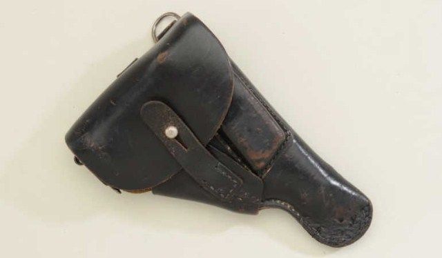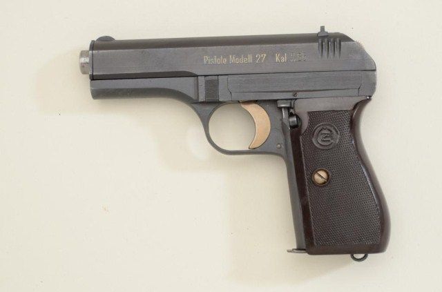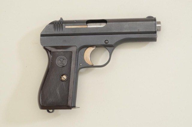 Czech C2 27, 32 Auto with Nazi proofs and late WW11 Finish #211501. Botmische Waffenfabrick, Prague. Near fine, slight use, minor wear. Bright bore, mk’d clip. Black leather model 27 marked holster withextra clip. Est.:$300-$600.