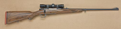 Czech CZ bolt action sporting rifle on Mauser action in 8x57S caliber with Mannlicher type spoon bolt, 1950-date, finely restocked and upgraded by George Hoenig of Boise, ID, with finger release rail mount for scope and Leopold M8 4-power compact scope. The rifle shows finely remanufactured bolt-handle, trigger guard, and floorplate release, and European type sling swivels added. The rifle is finely stocked in select walnut, cleanly checkered, and shows a metal grip cap with Hoenig markings. The rifle is finely polished and rust blued, the action polished, the bore excellent. Folding rear sight and finest European lines and styling. George Hoenig is considered one of America’s finest rifle makers. Serial #31908. From the Robert Petersen Collection. Est: $2,000 - $4,000