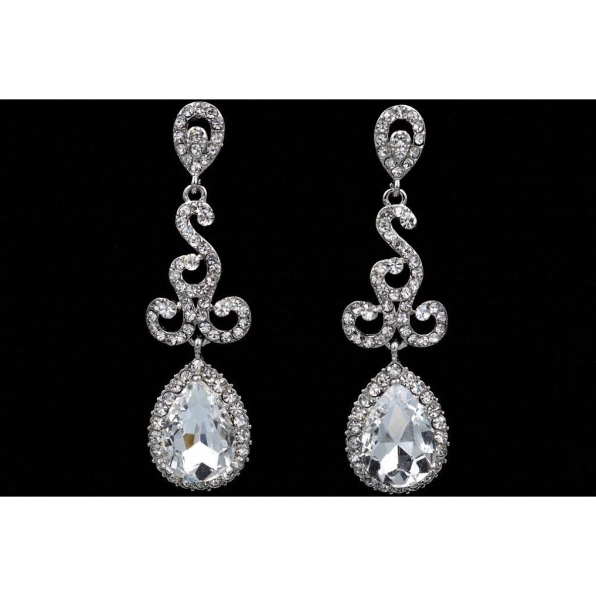 Clear Czech crystals set into rhodium plated bridal drop earrings. 2 1/2" L. Â