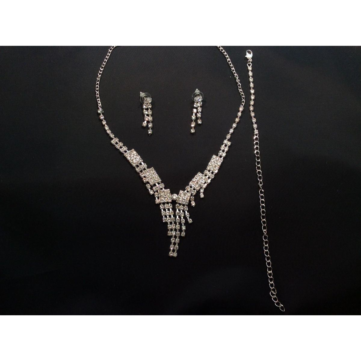 Perfect for a multitude of formal occasions from weddings to formal dances or events, this rhinestone crystal set is sure to dazzle. Complete with matching earrings and bracelet to complement the stunning necklace, this set comes presented in a beautiful jewelry box for safekeeping.