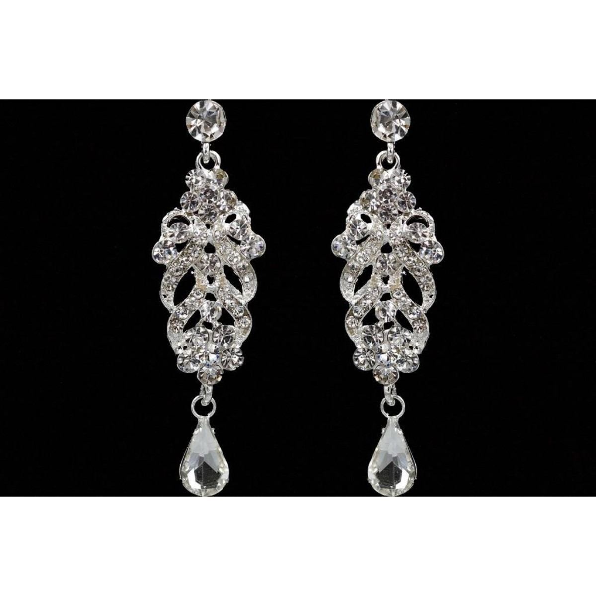 Clear Czech crystal teardrops dangle from an elegant fretwork of rhinestones set into silver plated chandelier drop earrings. 2 1/2" L. 9787-031018-EB-32171