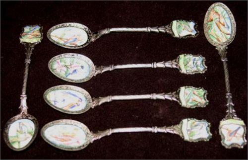 Czech Enameled Bird Collector Spoons, Set of 6.