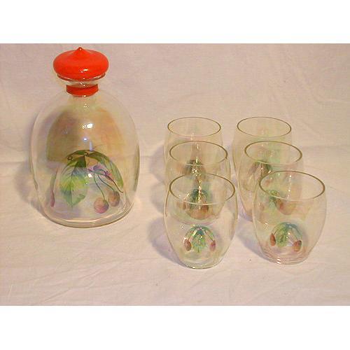 </font></strong>Czechoslovakian wine or juice set, hand blown and reverse hand painted enamel under glass, circa 1940s. The lovely cherry and leave design shows great detail and color, glowing through the clear crystal which has a faint iridescent finish. The bottom of the decanter and each glass bells up into the body in a most unusual and attractive design. This set is in great shape, with only tiny wear chipping around the ground edge of the stopper; one glass has a chip on the rim. The decanter is 8.5 " high x 5.5" in diameter, and each glass is 3.25" high x 3.125" in diameter. <P>Service a Liqueur Verre émaillée, Czechoslovakie années 40, très bon état sauf pour une petite éclat sur le bord d'une verre. <BR>Lieu: Etats-unis