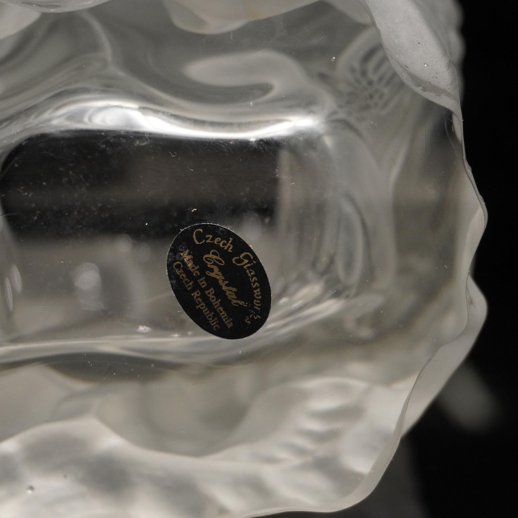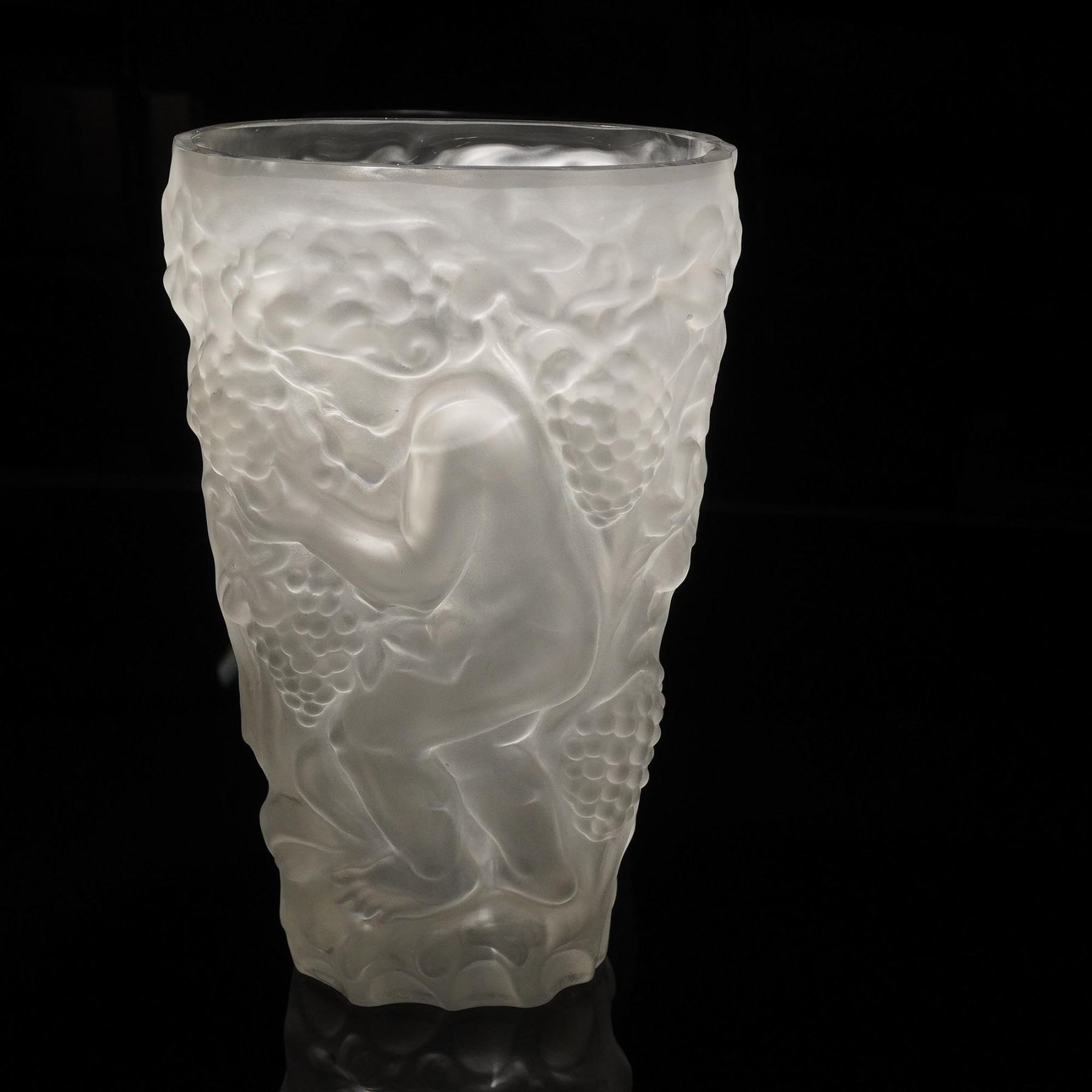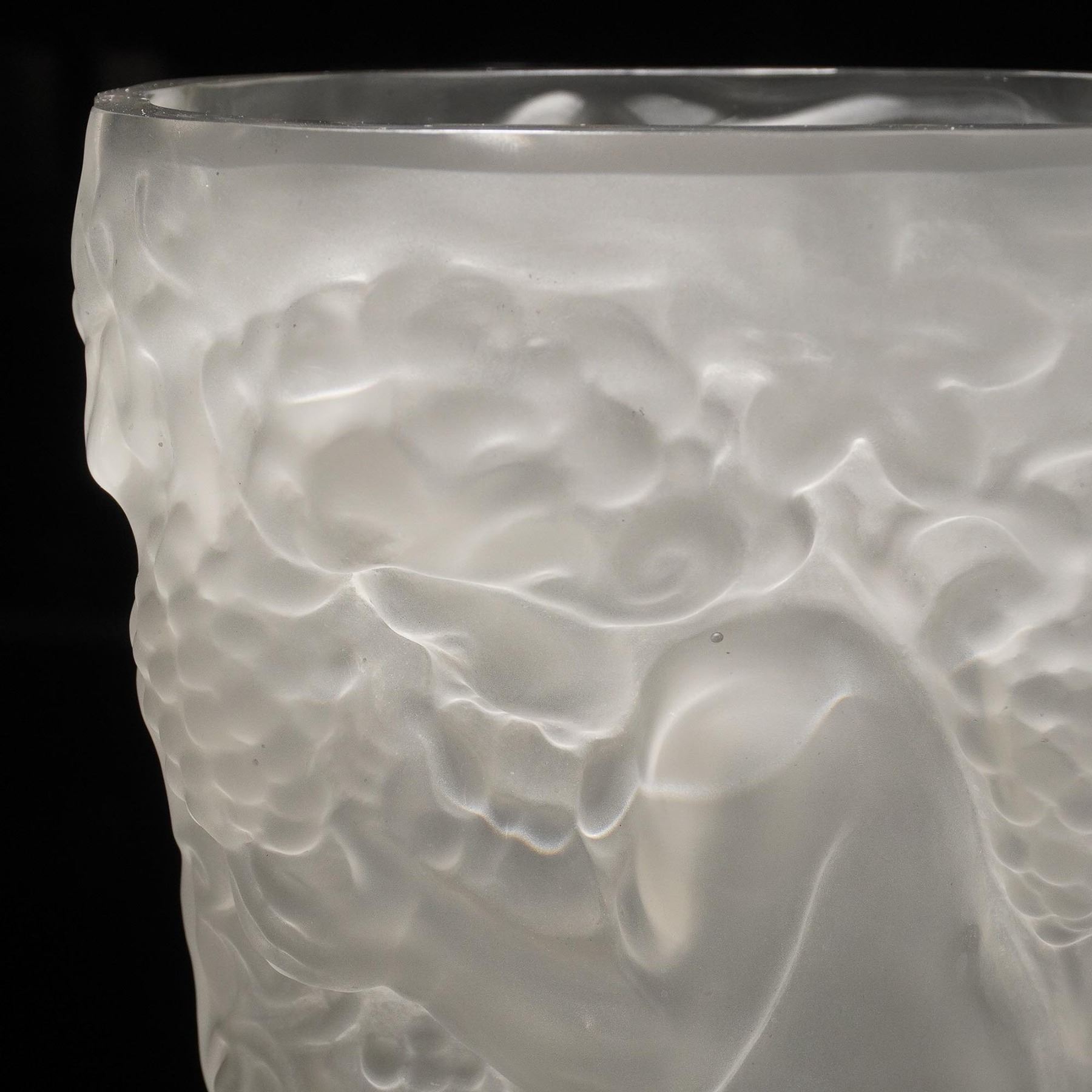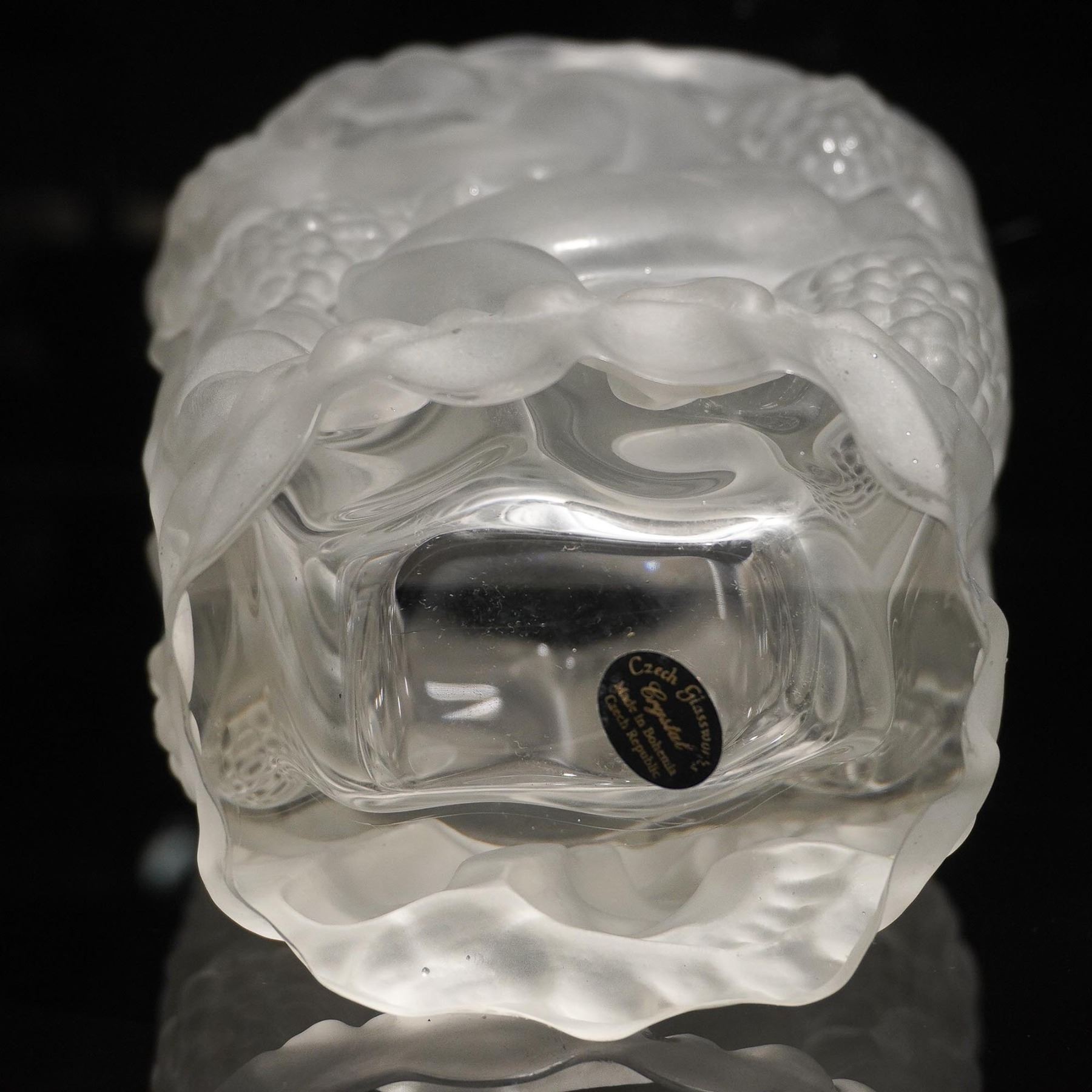 Czech glass vase featuring an intricate frosted and clear design of putti among grapevines, attributed to Bohemia Crystal and made in the Czech Republic. The vase showcases finely detailed relief work, with cherubic figures in high relief encircling the body of the vessel amidst grape clusters and vines. Crafted in thick, heavy crystal with a satin frosted finish, this piece is reminiscent of Art Deco styles and pays homage to classical motifs often seen in Lalique-inspired glasswork. Retains its original foil label marked Czech Glassware Bohemia, Made in Bohemia, Czech Republic. H 11".