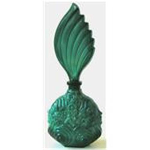 This stunning, classic bottle was hand-crafted from vintage molds by glass artists in Czechoslovakia. Known as ?Duo? or ?Two Faces? this beautiful Bohemian Art Deco handmade Malachite glass perfume bottle features a very detailed face of a young girl on both sides of the floral decorated jade green glass bottle. The large Malachite glass ground stopper is shaped like a feather. This truly striking perfume bottle, with stopper, measures nearly 9" tall, and is in excellent condition.