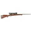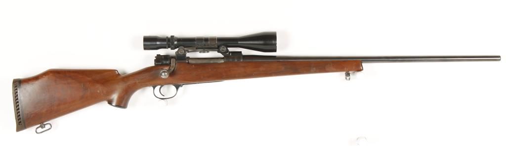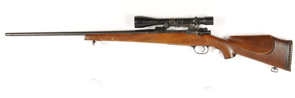 Sporterized Czech Mauser bolt action rifle with 24" barrel. Blued finish, pistol grip wood stock with cheek piece, rubber recoil pad, sling swivels, no sights and fitted with early Bausch & Lomb "Balvar 8" 2.5-8 power scope. Hinged floor plate engraved with Pronghorn head and floral pattern. Dark bore and good action. Condition: Good showing normal dings and light scratching on wood. *Curio & Relic Firearm*