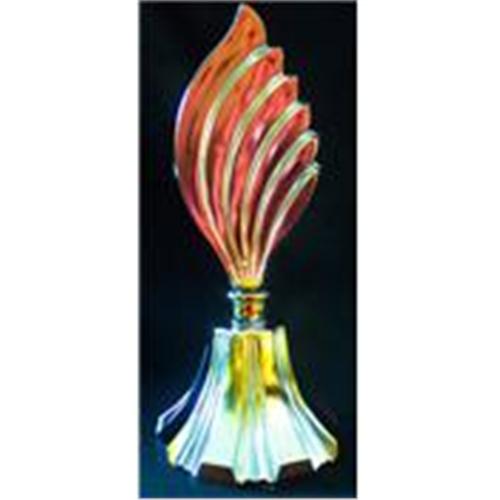 This gorgeous Czech geometric Art Deco metallic iridescent flared and ribbed perfume bottle, with a tall feather shaped stopper, is from a special edition that was produced during the 1950's. The sticker on the bottom reads Bohemia Crystal - Made in Czechoslovakia. Measuring 7 1/2" tall the bottle and its stopper are both in excellent condition