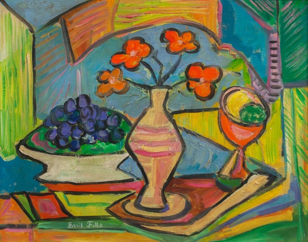 Oil on canvas, framed. Featuring still-life of a vase of flowers and a bowl of grapes. Signed "Emil Filla" to the bottom left. Canvas size: 39 x 49 cm (15.5 x 19.3 in) Frame size: 46 x 56 cm (18 x 23 inch).
