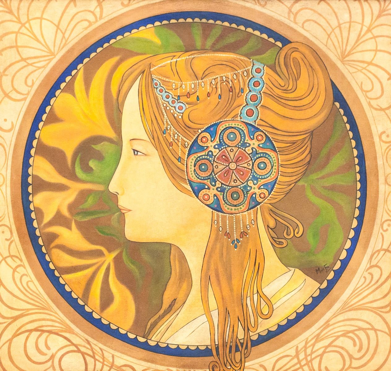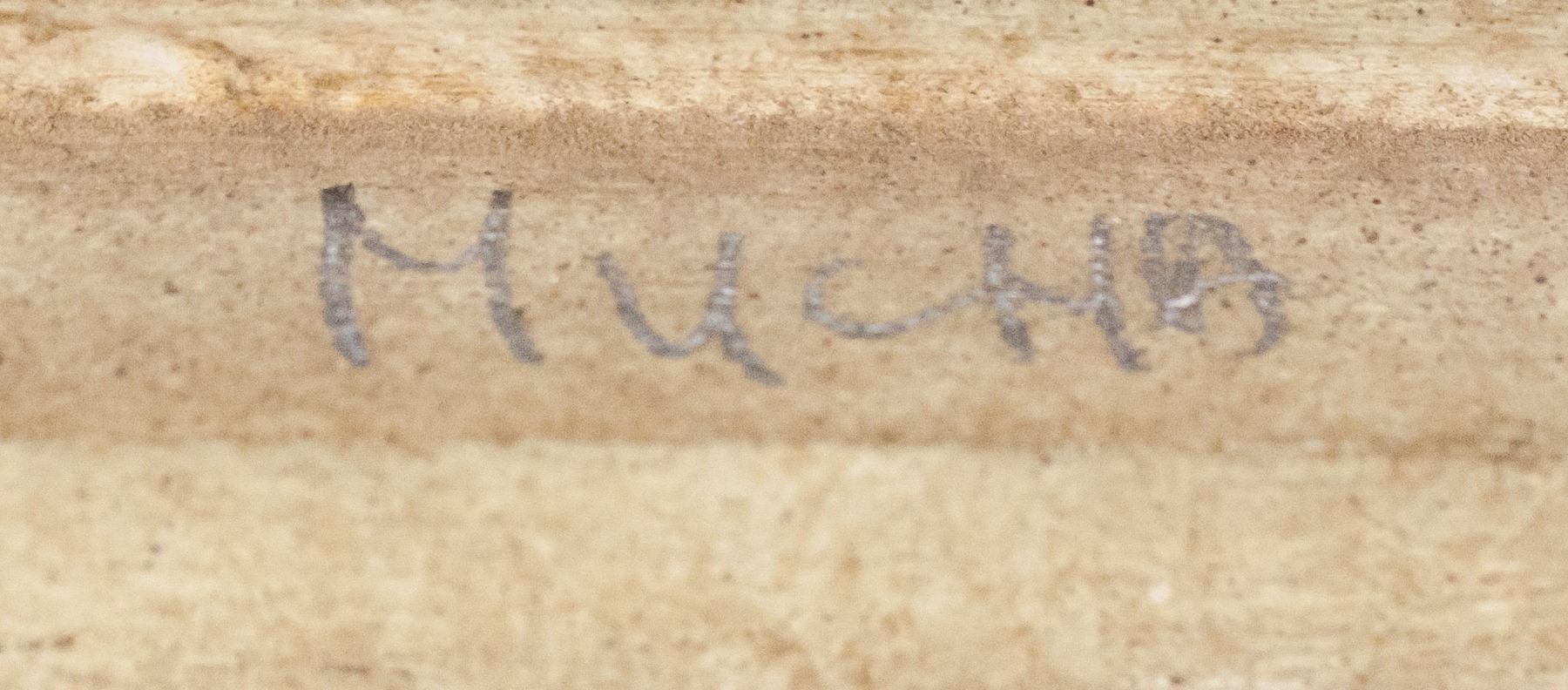 Oil on canvas, framed. Featuring profile portrait of a woman. Signed "Mucha" toward the bottom right of the portrait. 95 x 101 cm (37 x 40 in), Frame: 122 x 128 cm (48 x 50 in).