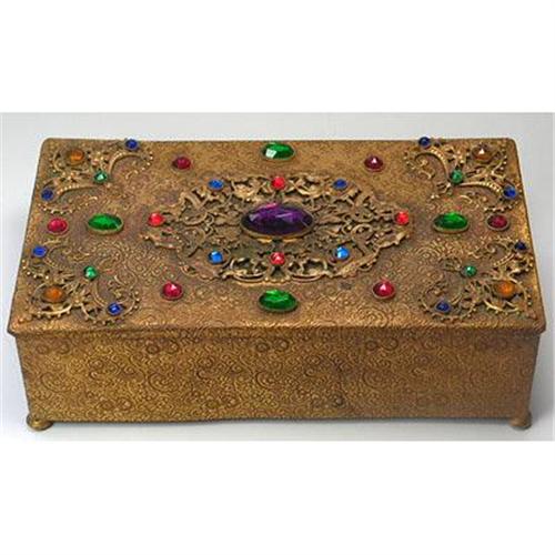 This outstanding ornate jeweled ormolu or brass jewelry box was produced in Czechoslovakia during the early years of the 20th century. The intricate and exquisitely detailed finely raised filigree designed lid is mounted with thirty five glass jewels of varying sizes, is highlighted with a large centered oval glass amethyst color stone, and is further adorned with an ornate Fleur-Di Lis medallion on each corner and one large oval medallion in the center. The box has a similar intricate, exquisitely detailed finely raised filigree design and has a teak lining, which is rare. Measure 6 1/2 inches x 3 1/2 inches x 2 inches tall and is in excellent condition for its age.