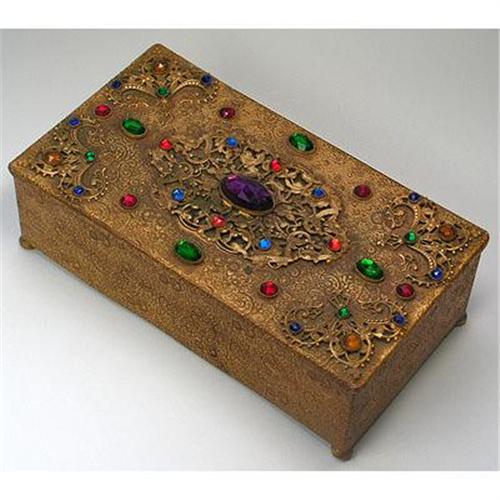 This outstanding ornate jeweled ormolu or brass jewelry box was produced in Czechoslovakia during the early years of the 20th century. The intricate and exquisitely detailed finely raised filigree designed lid is mounted with thirty five glass jewels of varying sizes, is highlighted with a large centered oval glass amethyst color stone, and is further adorned with an ornate Fleur-Di Lis medallion on each corner and one large oval medallion in the center. The box has a similar intricate, exquisitely detailed finely raised filigree design and has a teak lining, which is rare. Measure 6 1/2 inches x 3 1/2 inches x 2 inches tall and is in excellent condition for its age.