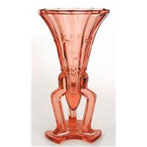 Produced in Chekoslovakia circa 1930 this pink Depression glass Art Deco rocket vase features three curved Machine Age legs and an outstanding flared panel optic bowl. Measuring 6 1/2 inches tall x 4 inches across the rim x about 2 inches across its triangular footed base and is in excellent condition