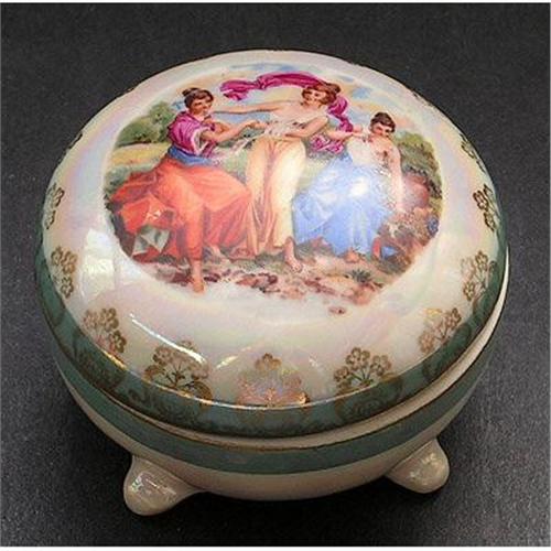 This lovely porcelain jar with a lusterware finish was produced in Czechoslovakia during the early 20th century and so marked on the bottom of the footed jar. The lid features three brightly clad ladies in a wooded garden with a surround border of gold flowers and sits atop a four footed jar