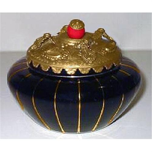 This very unusual Art Deco Czech, circa 1930s, purple glass powder jar features an intricately detailed ormolu or brass lid topped with a covered red glass jewel ball. The base is adorned with symmetrical gold stripes. Measuring about 5" wide x 3" tall and all in excellent condition.