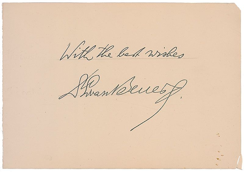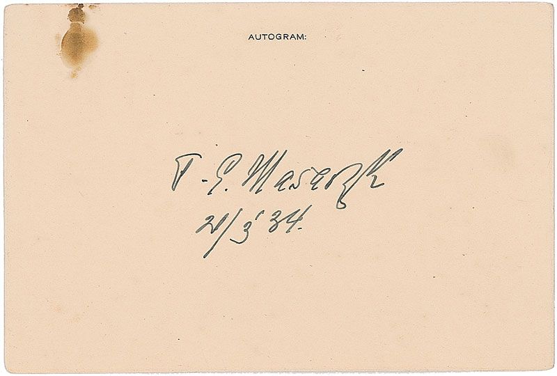 Two signatures: a fountain pen signature of Tomas Masaryk on an off-white 5 x 3.25 card, dated March 21, 1934; and an extremely large fountain pen signature of Edvard Benes on an off-white 10 x 7 sheet. In overall fine condition, with a small stain to the top of the Masaryk card.
