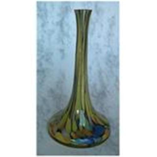 Czech Stick Vase with cobalt liner. The exterior colors are: blue, yellow, green, orange, brown and different shadings of these colors. NOT SIGNED. Triple cased. The vase has multi colors. The neck glass has been stretched, along with the colors. Flat, smooth bottom. Excellent condition. 8"" tall.