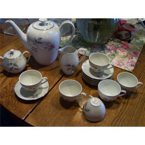 This is a beautiful set.I am not sure if it is a tea set or coffee.Has small demittase cups,sugar,creamer and coffee/tea pot.All in excellent condition.The mark on the bottom says-TK-Thun-Czechoslovakia,and has a crown above it.Very pretty set with roses.