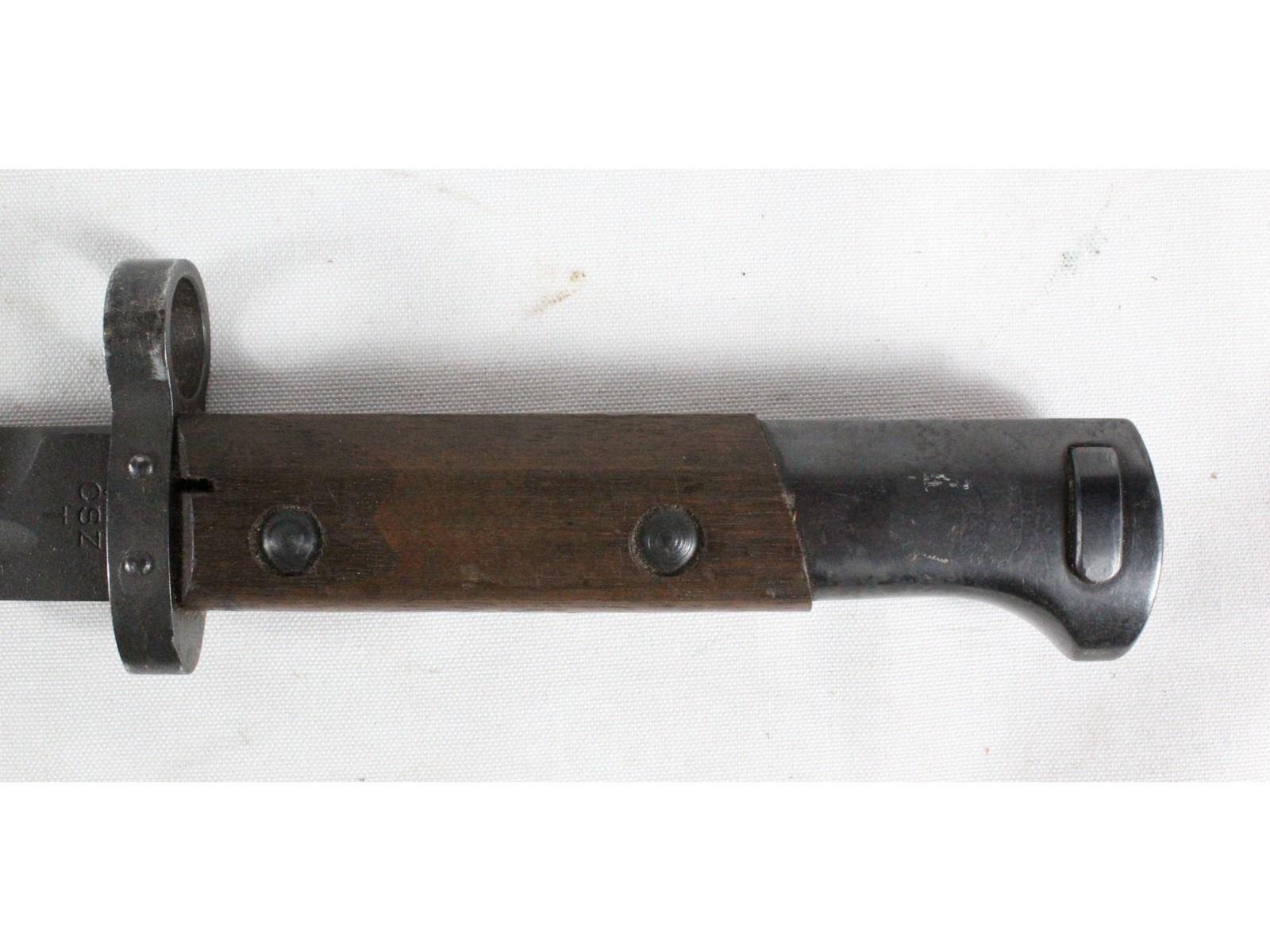 Blade measures 11.75", overall 17.5". Exceptional blade with sharp edge facing up. Frog stamped "CSZ with T". Scabbard shows very slight wear. Grips are excellent. Pommel marked 1279. Scabbard marked 37. Nice light brown, correct frog. Blued blade.