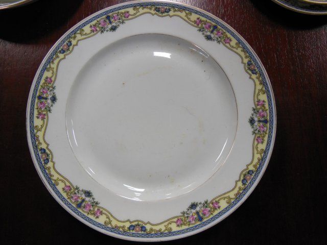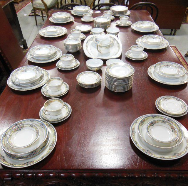 Including: 11 dinner plates (1 chipped), 11 salad plates, 9 soup bowls, 23 cake plates, 15 berry bowls ( 1 with small chip), 4 cream soups, 7 cream soup saucers, 8 cups, 14 saucers, 1 covered butter dish, 1 platter approx. 17.5". Approx. 104 pieces in total.