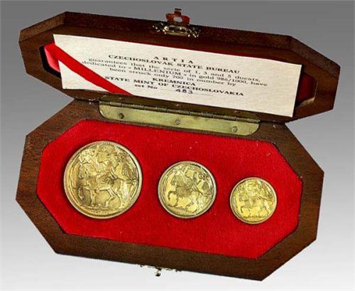 Czechoslovak Republic - gold - 1, 3 e 5 ducati del 1929 riconiati ufficialmente nel 1973 - Peso complessivo in oro di alto titolo gr. 31 circa - Nell'astuccio originale - Au