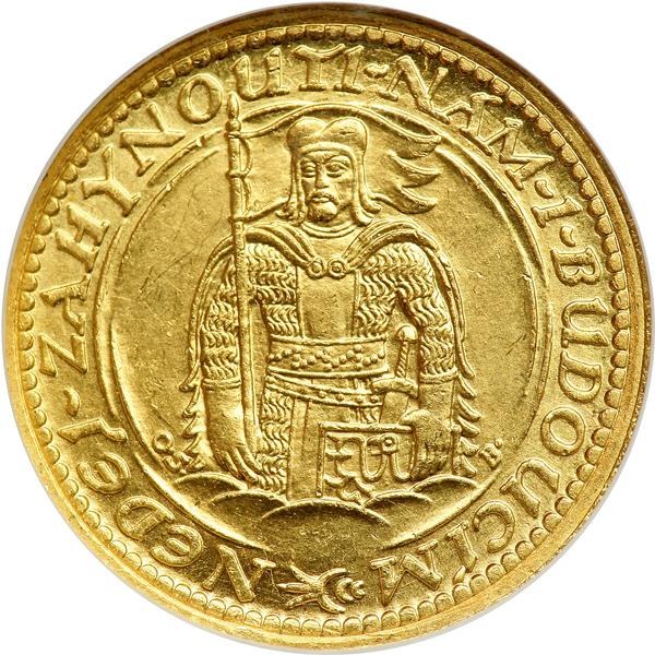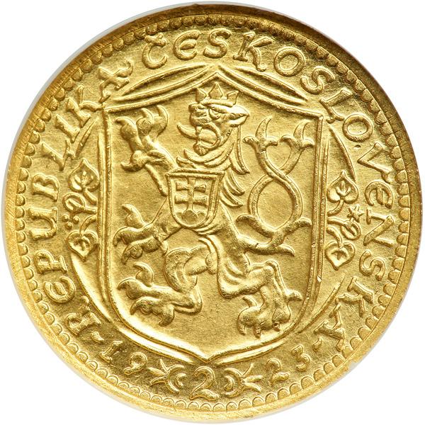 Czechoslovakia. 2 Ducats, 1923. Fr-1; KM-9. Weight 0.2213 ounce. Half-length figure of St. Wenceslas. Reverse: Shield. NGC graded MS-62.