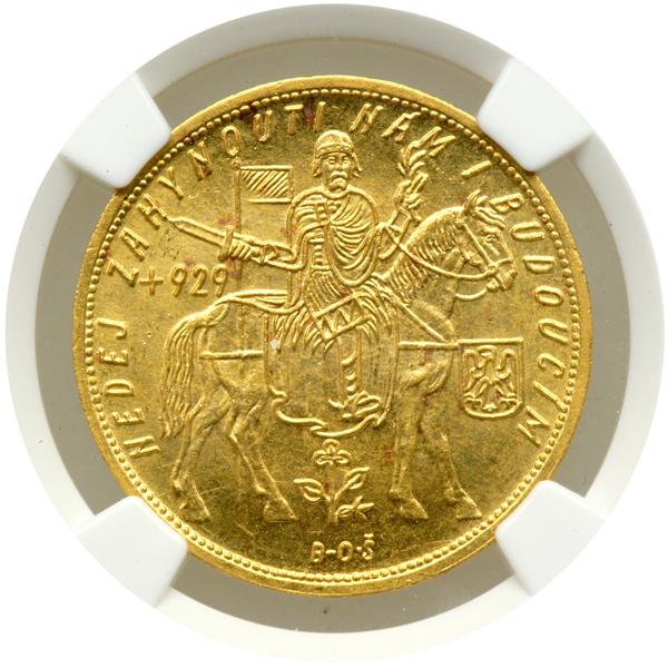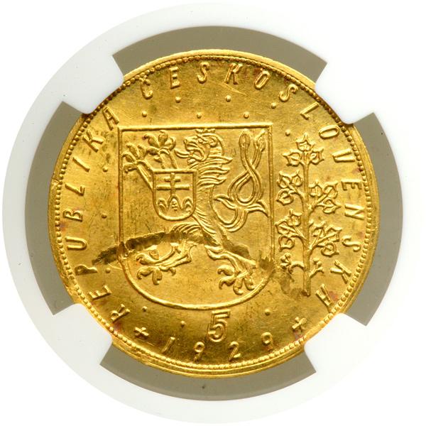 Czechoslovakia. 5 Ducats, 1929. Fr-5; KM-13. Weight 0.5532 ounce. St. Wenceslas on horse. Reverse: Shield. Major reverse damage from 4 o'clock to 7 o'clock. NGC graded Uncirculated, Details.