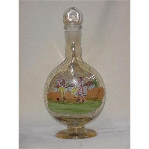 A glass decanter, 12" tall with stopper decorated with a couple dancing while a third man plays a bag pipe. All flat surfaces are beautifully polished. Hand painted by Borokristal in Czechoslovakia O. Gartner ( written on side of decanter.) Condition is very good.