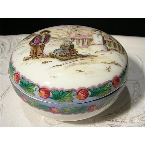 A very nice Box marked MZ Altrouhlau CMR. Very well decorated painted by hands, children playing in the snow. Totally hand painted. In perfect conditions. From Czechoslovakia. The cover has a orange mark as you can see in the last picture.