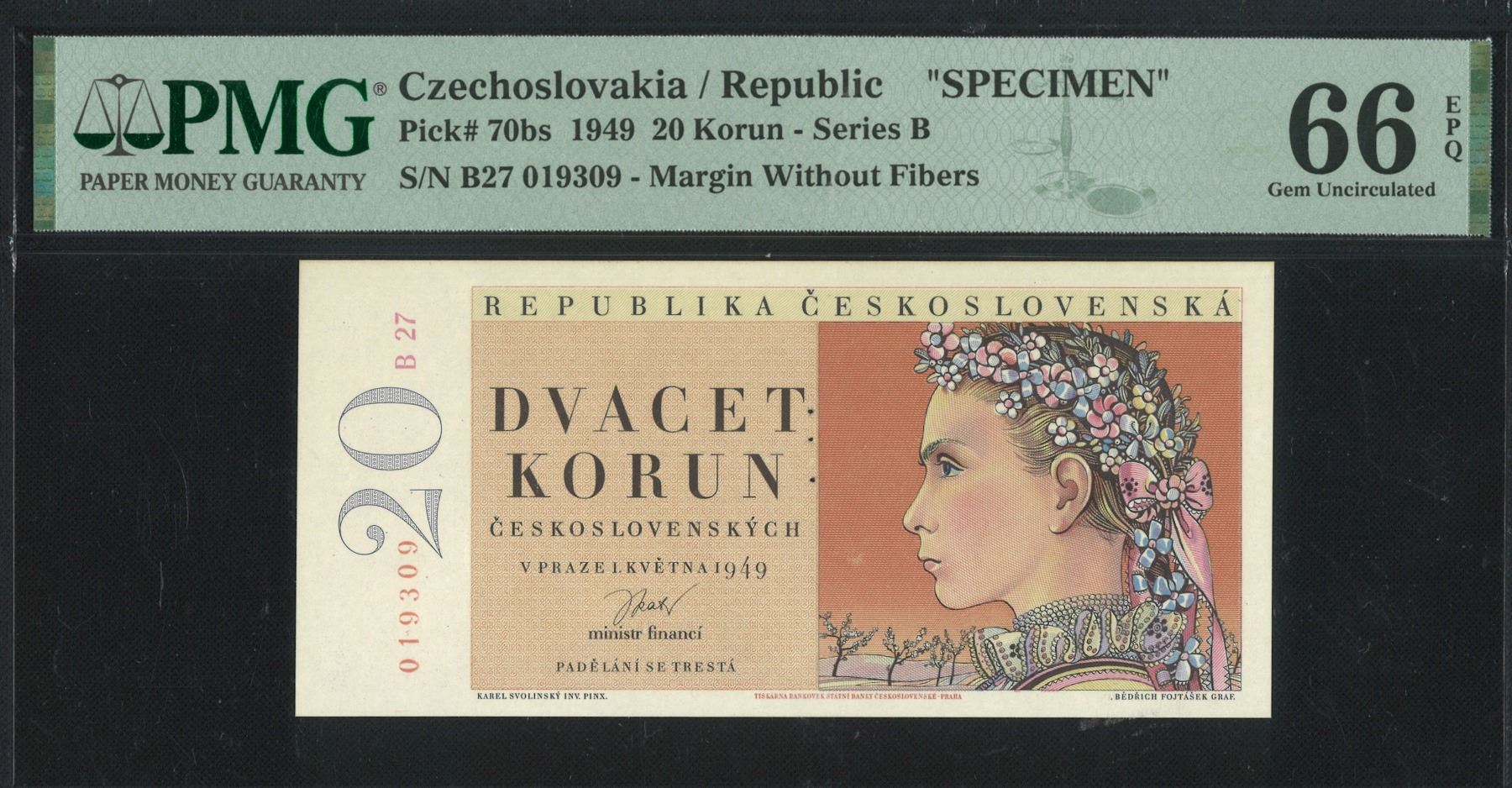 Czechoslovakia/ Republic, 1949, 20 Korun Specimen, B27 019309. PMG 66EPQ.