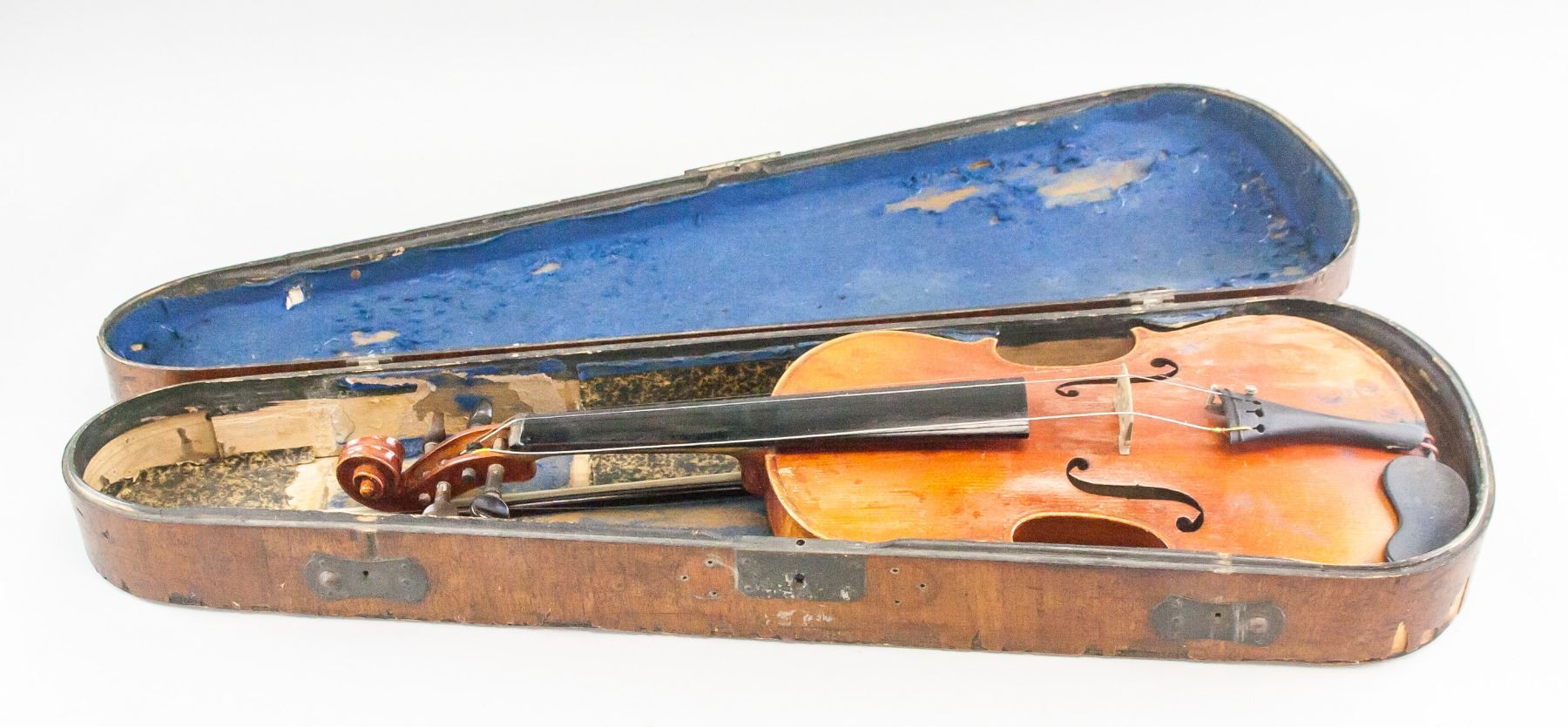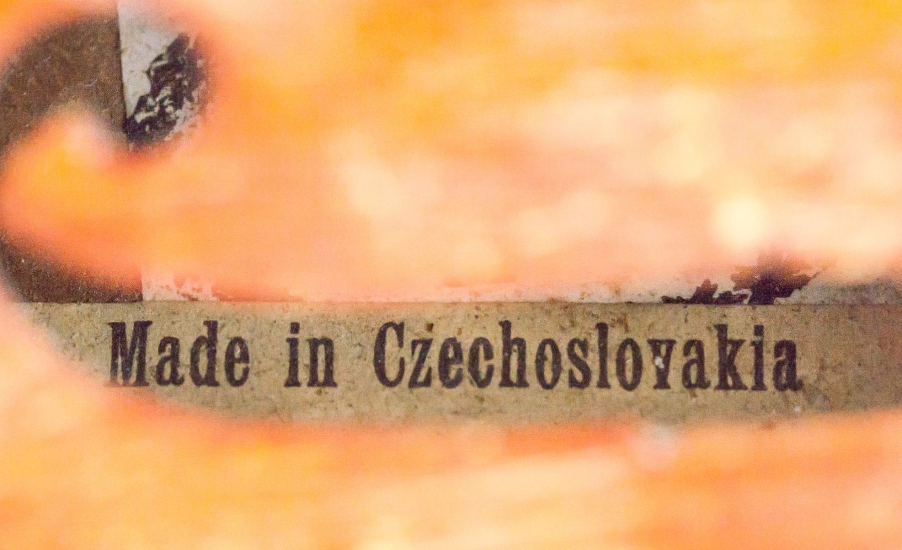 Light brown violin. Damaged condition. Missing a string and fine tuning pegs. "Made in Czechoslovakia" label inside. 60.5 x 20.5 cm