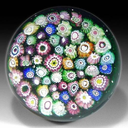 Czechoslovakian close packed millefiori paperweight. A colorful assortment of canes rest on translucent dark green ground, flecked with chips of mica. Diameter 2 5/8".