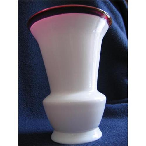 An opaque white glass is cased inside with clear rosy pink glass fading to white deep inside. The pink upper edge has several tiny bubbles in the glass. The base, which is a little over 2 1/2 inches across, shows a ground pontil and is acid etched with "Czecho-slovakia." There are no chips or cracks.