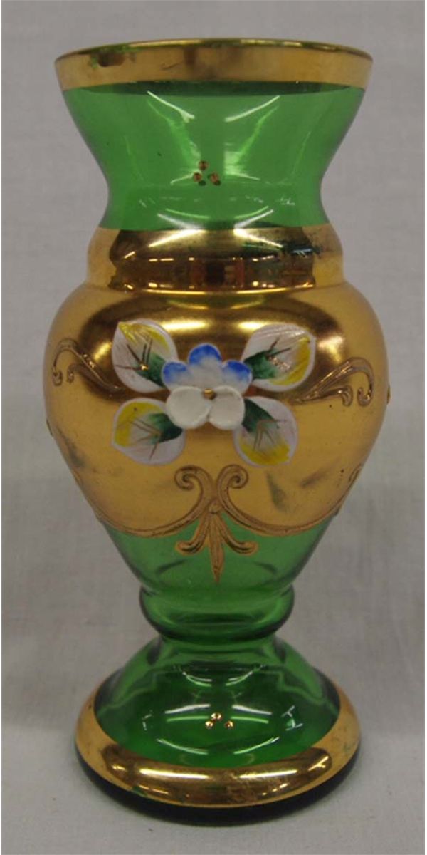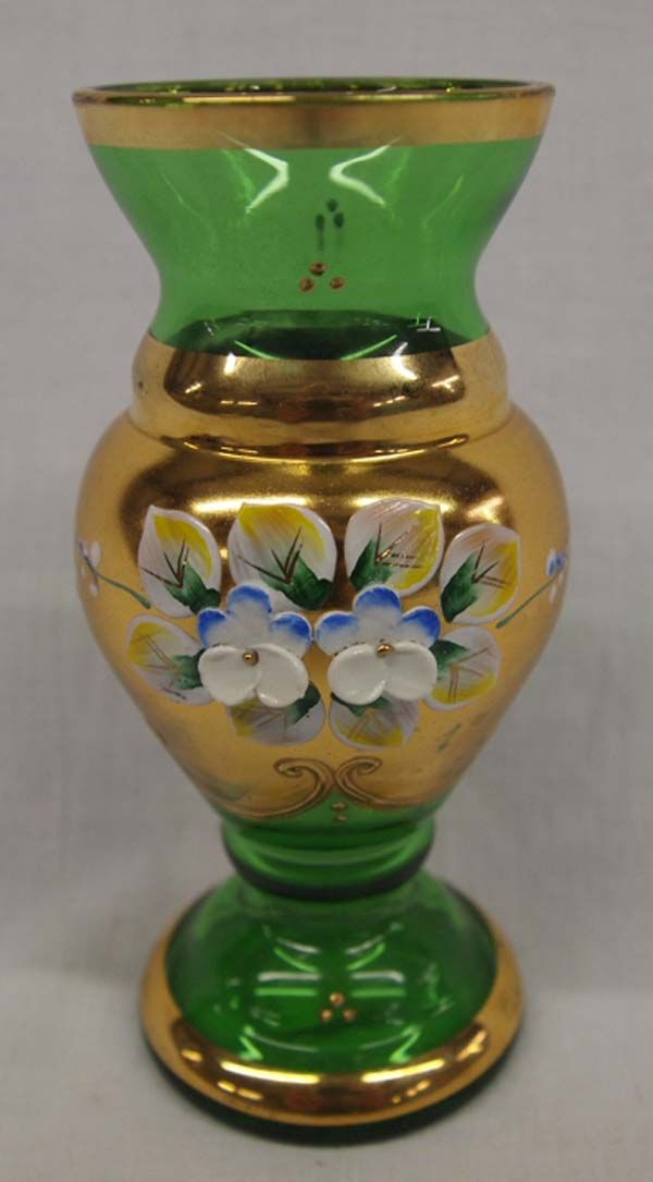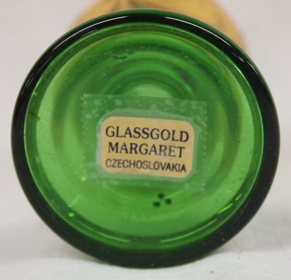 Czechoslovakian Handpainted Vase. Green glass vase, heavily gilded and dimensionally decorated, measuring 5''. Paper label ''Glassgold Margaret Czechoslovakia''.