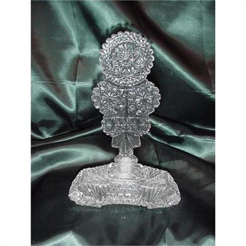 A Czechoslovakian Crystal Perfume Bottle. 9" tall overall, bottle is 6" tall. Marked in circle. (small chip on stopper, dabber is missing)