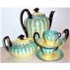 This fantastic Czechoslovakian Demi Tea Set is decorated with a alovely Yellow Sun Burst Pattern on a Green and White Background and the handles and finials are decorated with a fantastic black glazed finish. This set includes one coffee pot, one sugar bowl, one creamer and two demi cups and two saucers. All of the items are in SUPERIOR condition with no chips, cracks, dings or hairlines and they are marked on the bottom with the familiar Phoenix Logo. The coffee measures 6.50" from spout to handle and is 7.50" tall to the top of its finial, the sugar measures 6.50" from handle to handle and tis 4.75" wide and stands 4" tall, the creamer is 5" from spout to handle and 3" wide and stands 3.25" tall while each of the demi cups are 2.125" in diameter and stand 2" tall and each saucer is 4.25" in diameter.