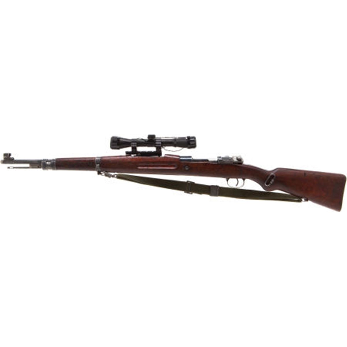 Czechoslovakian VZ24 Bolt Action Carbine. Serial no.HR22312, 8mm, 23 1/2-inch barrel with standard sights. Import stamps. Mounted with an aftermarket NcStar telescopic sight on a B-Square rail. Blued finish. Straight bolt toggle. Walnut stock and armguard. Sling mounts. Olive web sling. Condition: Fair to good as configured. Retaining approximately 40-50% reblued finish with scattered wear and patina. NRA FIREARMS FOR FREEDOM PROGRAM
