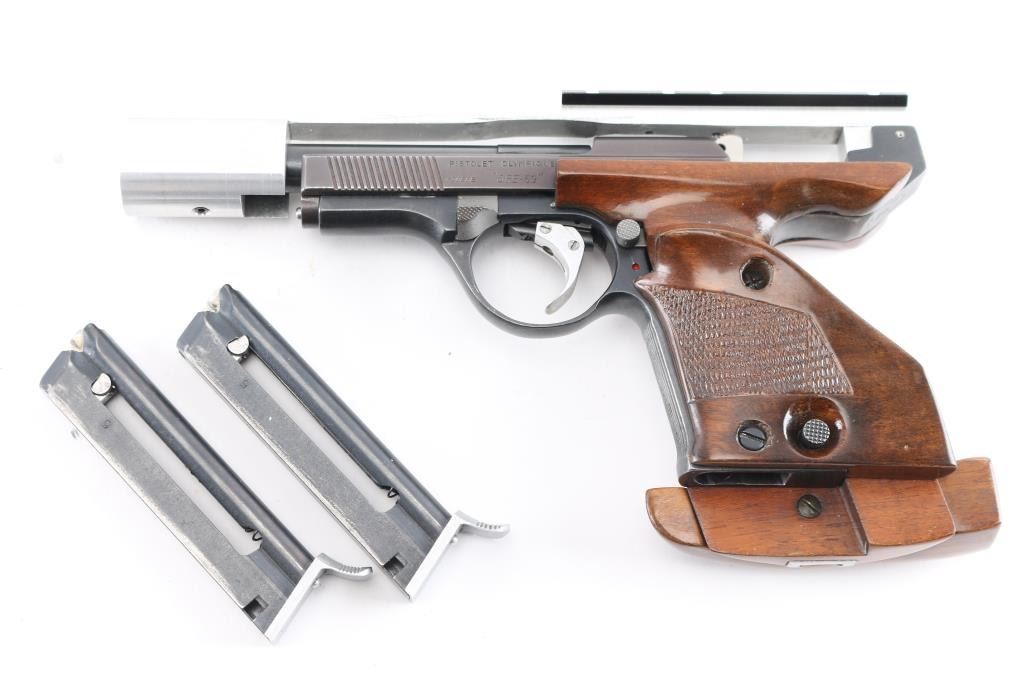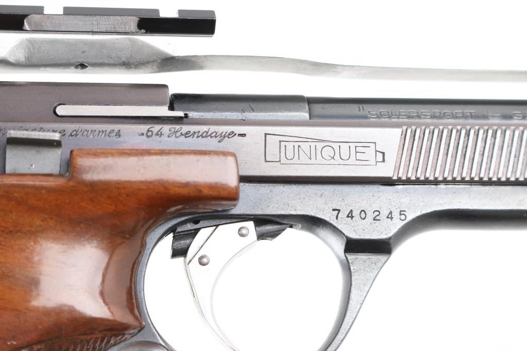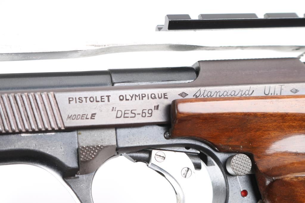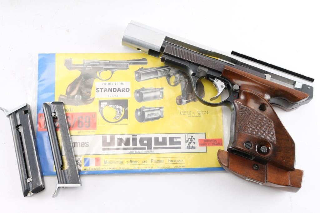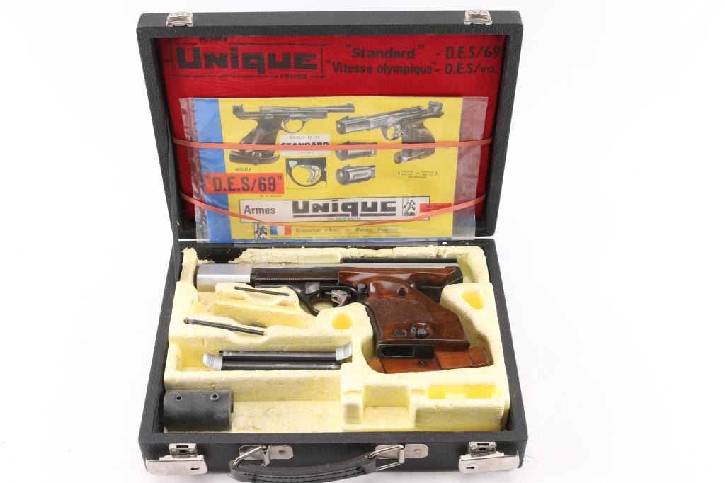 French Unique D’armes Des Pyrenees Francaise DES/69 Standard U.I.T., Blue & Phosphate finish, 5.91" barrel. Semi-Automatic Olympic Competition Pistol The right side of the pistol is marked “Manufacture d’armes / 64 Hendaye / UNIQUE / 740245”. The barrel is marked “SOLERSPORT – SEATTLE” and “CAL. 22 L.R. – Made in France” and "St, Etienne": with crown proof. The left side of the slide is marked “PISTOLET OLYMPIQUE Standard U.I.T / MODELE “DES-69”. The grips are factory French walnut with thumb-rest and adjustable hand-rest. There is no checkering but a stippled pattern. Push button magazine release, manual safety. The pistol has been modified by removing the sights and adding an aluminum rail and barrel weight, the rail has provisions for a front sight, and a 4.5" sight/optics rail has been installed and a wide, serrated trigger extension has been installed. The original factory hard case with instructions, flyers, warranty cards, patch, and sticker, along with the original sights, original factory barrel weight, cleaning rod and tools. There are 2 factory marked magazines. The foam in the case is mostly intact with a little damage at the top left corner. The magazines and barrel weight are marked “UNIQUE”. The bore is excellent/bright, the action is smooth, the grips are excellent and the metal finish is near excellent with some handling wear on the serrated grip strap. Manufactured 1986-88,