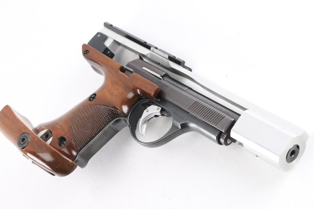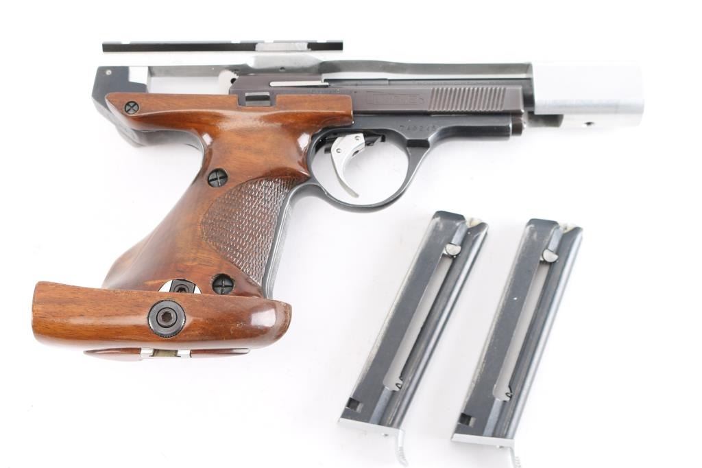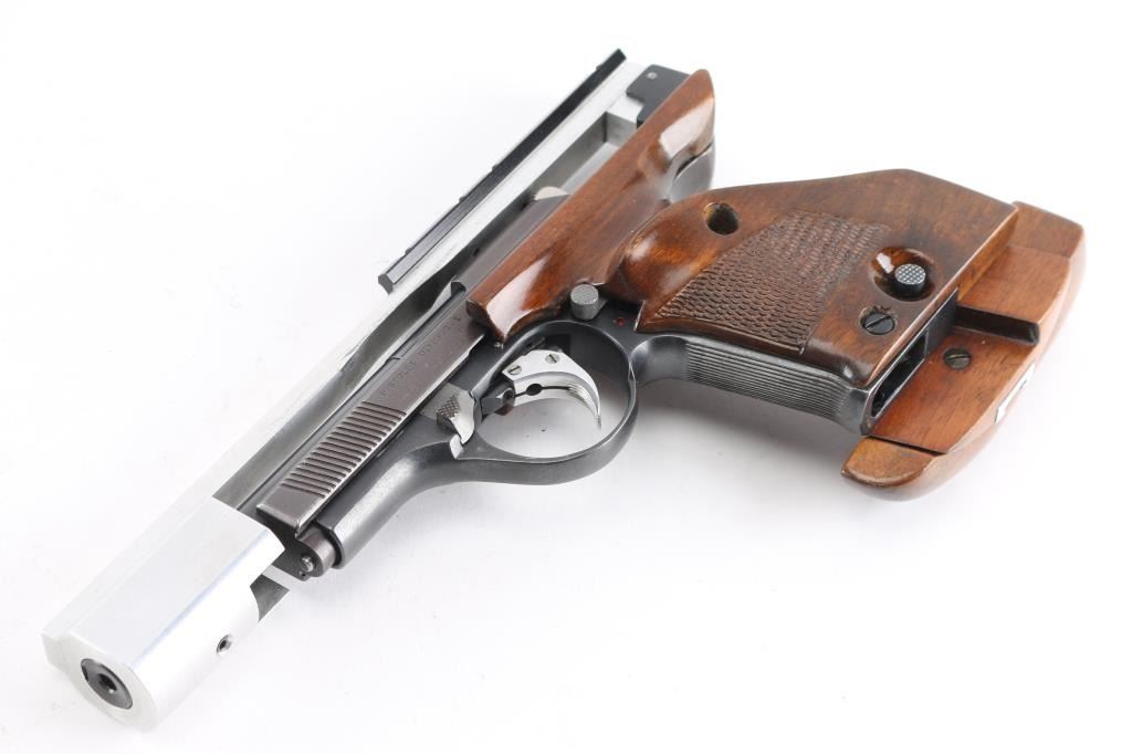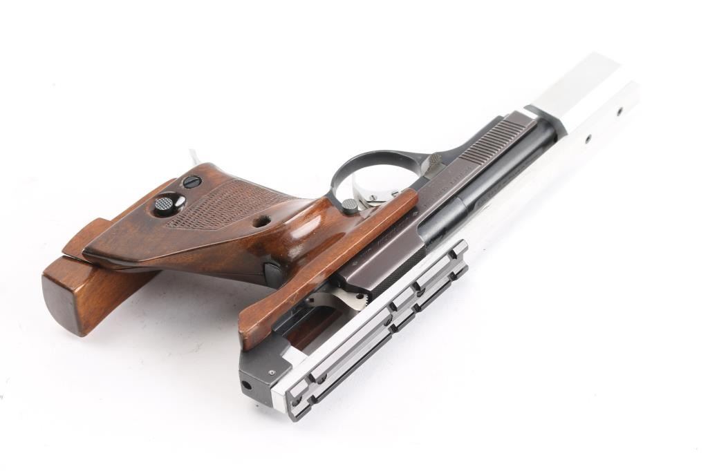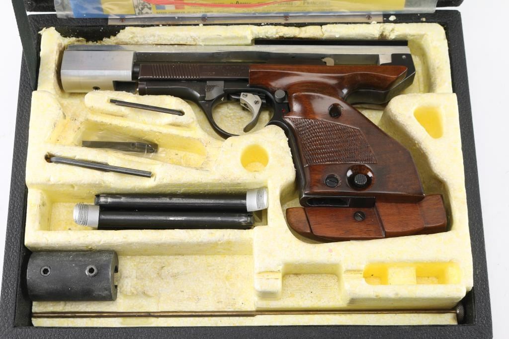 French Unique D’armes Des Pyrenees Francaise DES/69 Standard U.I.T., Blue & Phosphate finish, 5.91" barrel. Semi-Automatic Olympic Competition Pistol The right side of the pistol is marked “Manufacture d’armes / 64 Hendaye / UNIQUE / 740245”. The barrel is marked “SOLERSPORT – SEATTLE” and “CAL. 22 L.R. – Made in France” and "St, Etienne": with crown proof. The left side of the slide is marked “PISTOLET OLYMPIQUE Standard U.I.T / MODELE “DES-69”. The grips are factory French walnut with thumb-rest and adjustable hand-rest. There is no checkering but a stippled pattern. Push button magazine release, manual safety. The pistol has been modified by removing the sights and adding an aluminum rail and barrel weight, the rail has provisions for a front sight, and a 4.5" sight/optics rail has been installed and a wide, serrated trigger extension has been installed. The original factory hard case with instructions, flyers, warranty cards, patch, and sticker, along with the original sights, original factory barrel weight, cleaning rod and tools. There are 2 factory marked magazines. The foam in the case is mostly intact with a little damage at the top left corner. The magazines and barrel weight are marked “UNIQUE”. The bore is excellent/bright, the action is smooth, the grips are excellent and the metal finish is near excellent with some handling wear on the serrated grip strap. Manufactured 1986-88,