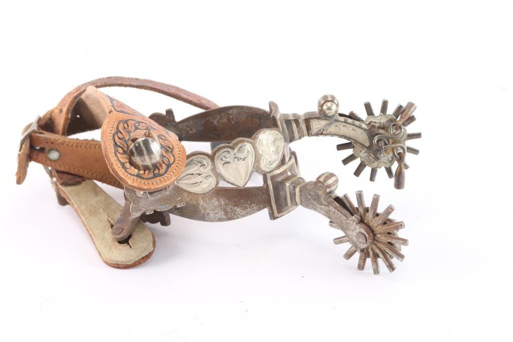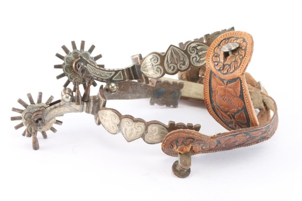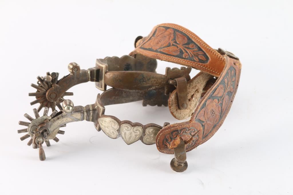 With heart motif, maker marked D. Bogt with two-tone floral tooled spur straps.
