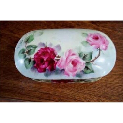 <tr><td>Title:D&C Limoges Trinket Jar - Handpainted Red Roses</td></tr>