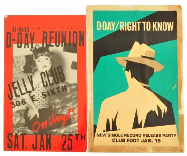 Club Foot, Austin, TX. January 15, 1989. Artist: Guy Juke. Linen backed. 11" x 17". D-Day Reunion Poster, "Too Young To Date". Jelly Club, Austin, TX. 1980s. 11" x 17".
